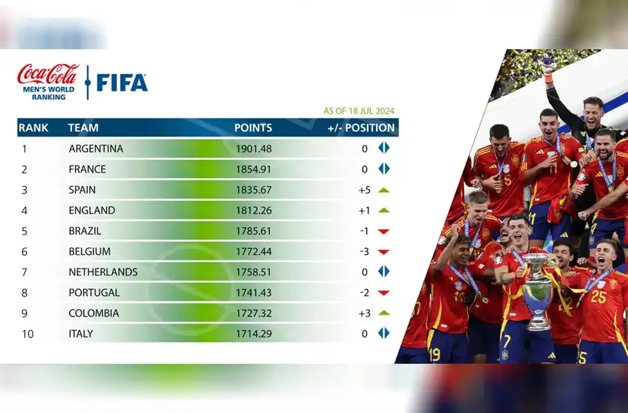 آرژانتین (اول) که با موفقیت از عنوان قهرمانی خود در کوپا آمریکا دفاع کرد، جایگاه خود را در صدر جدول تثبیت کرد. فرانسه (دوم) پس از رسیدن به نیمه نهایی یورو ۲۰۲۴ همچنان نزدیکترین رقیب آنهاست. اسپانیا، قهرمان جدید اروپا (سوم، با ۵ پله صعود) به جمع سه تیم برتر رده بندی رسید. در همین حال تیم بازنده فینال یورو یعنی انگلیس (چهارم، با ۱ پله صعود) درست پشت سر صدرنشینان قرار دارد و از سد برزیل (پنجم، با ۱ پله سقوط) گذشته است.
