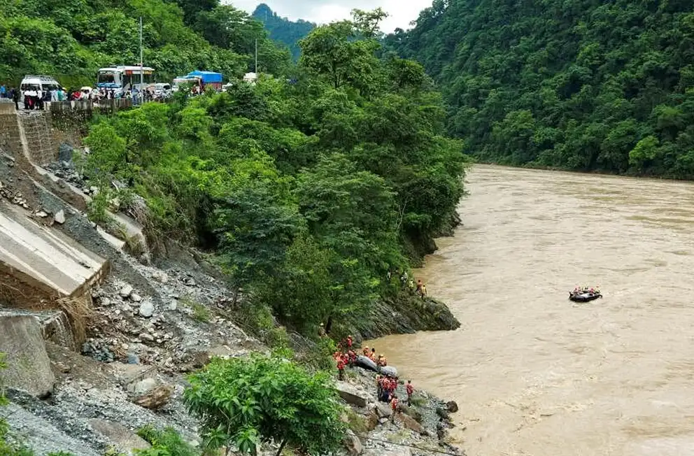 شدت رانش زمین چیتوان واقع در بخش مرکزی نپال، اتوبوس ها را پس از عبور دادن از موانع بتنی ۳۰ متر به سمت خاکریز پرشیب منحرف کرده است.