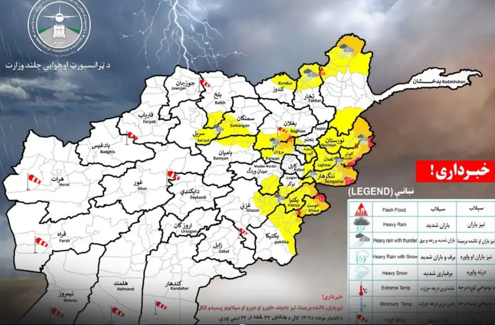 ریاست هواشناسی اعلام کرد این احتمال برای امروز و فردا در ولایتهای بدخشان، تخار، قندوز، بلخ، سرپل، بامیان، سمنگان، بغلان، پنجشیر، پروان، کاپیسا، نورستان، کنر، لغمان، ننگرهار، کابل، لوگر، پکتیا، خوست، پکتیکا، غزنی و میدان وردک پیشبینی شده است.