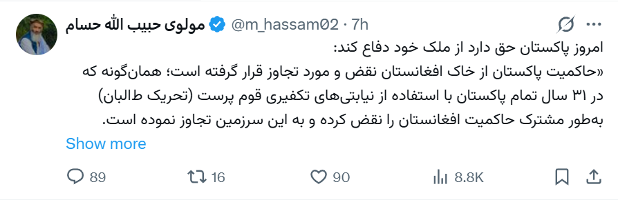 آقای حسام با اشاره به حملات اخیر که از خاک افغانستان به پاکستان صورت گرفته، نوشته است: حاکمیت پاکستان از سوی افغانستان نقض و مورد تجاوز قرار گرفته است؛ همانگونه که طی ۳۱ سال گذشته، پاکستان با استفاده از نیابتیهای تکفیری (تحریک طالبان) حاکمیت افغانستان را نقض کرده و به این کشور تجاوز کرده است.