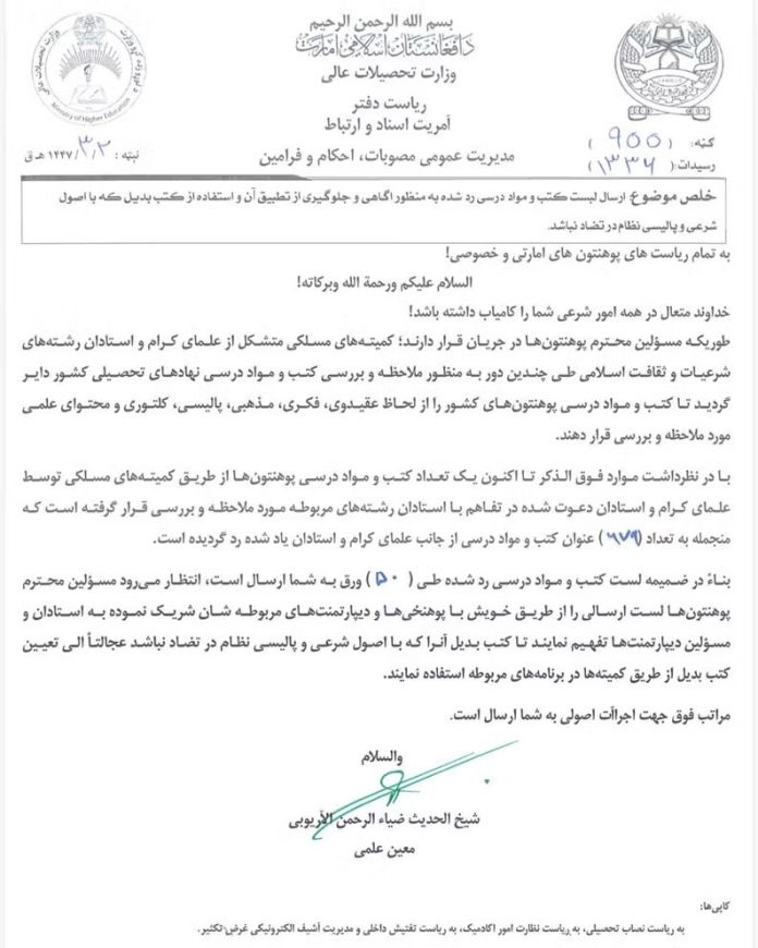 در نامهای صادره از سوی ضیاءالرحمن الاریوبی، معین علمی وزارت تحصیلات عالی در تاریخ چهارم سنبله، دانشگاهها ملزم شدهاند کتابهای ممنوعه را از برنامههای درسی حذف و جایگزینهایی متناسب با «اصول شرعی و سیاستهای نظام» اتخاذ کنند.