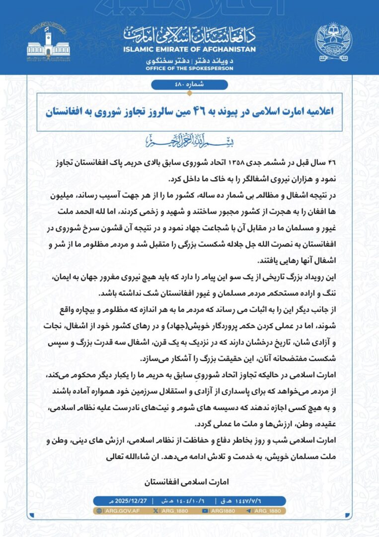در بیانیهای که ذبیحالله مجاهد، سخنگوی طالبان، روز شنبه (۶ جدی) در شبکه ایکس منتشر کرد، آمده است: «امارت اسلامی در حالی که تجاوز اتحاد شوروی سابق را یکبار دیگر محکوم میکند، از مردم میخواهد که برای حفظ آزادی و استقلال، همواره آماده باشند و اجازه ندهند دسیسههای شوم و نیتهای نادرست علیه نظام اسلامی، عقیده، وطن، ارزشها و ملت ما عملی شود.»