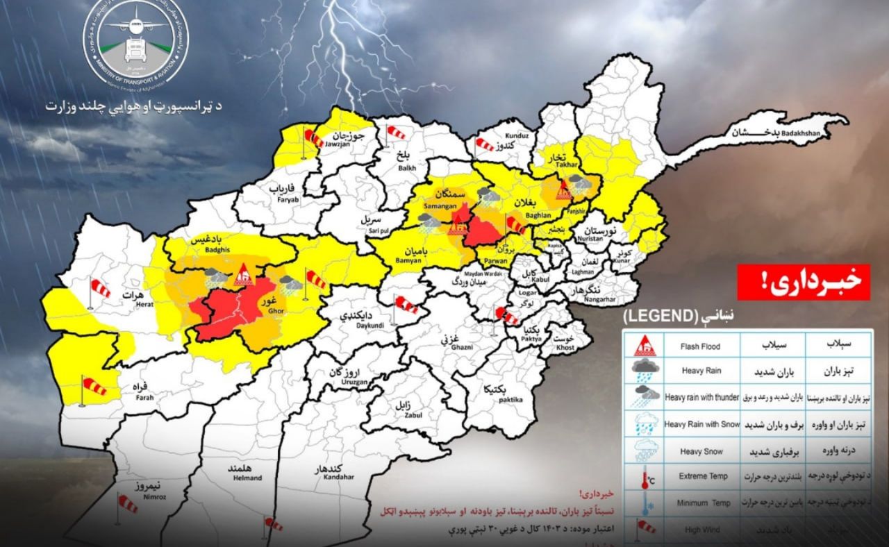 به گزارش خبرگزاری معمار، ریاست هواشناسی وزارت ترانسپورت و هوانوردی کشور هشدار داده است که فردا، یکشنبه ۱۳ میزان، بخشهای گستردهای از افغانستان شاهد بارندگی شدید، وزش بادهای تند و احتمال وقوع سیلاب خواهد بود.